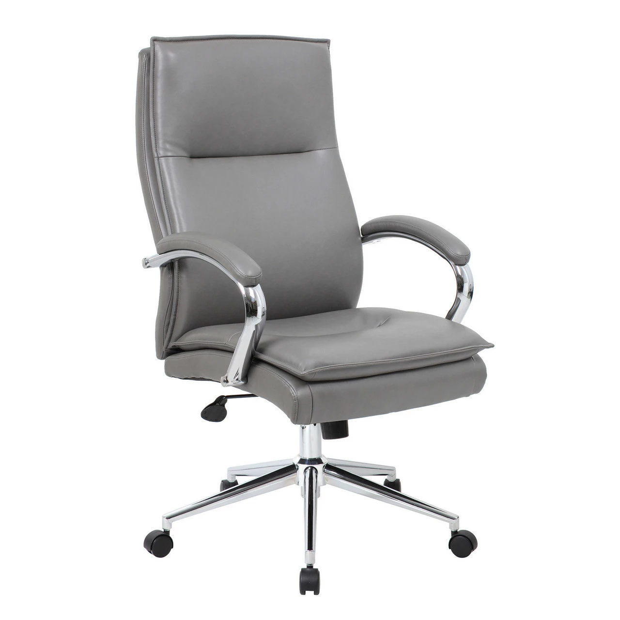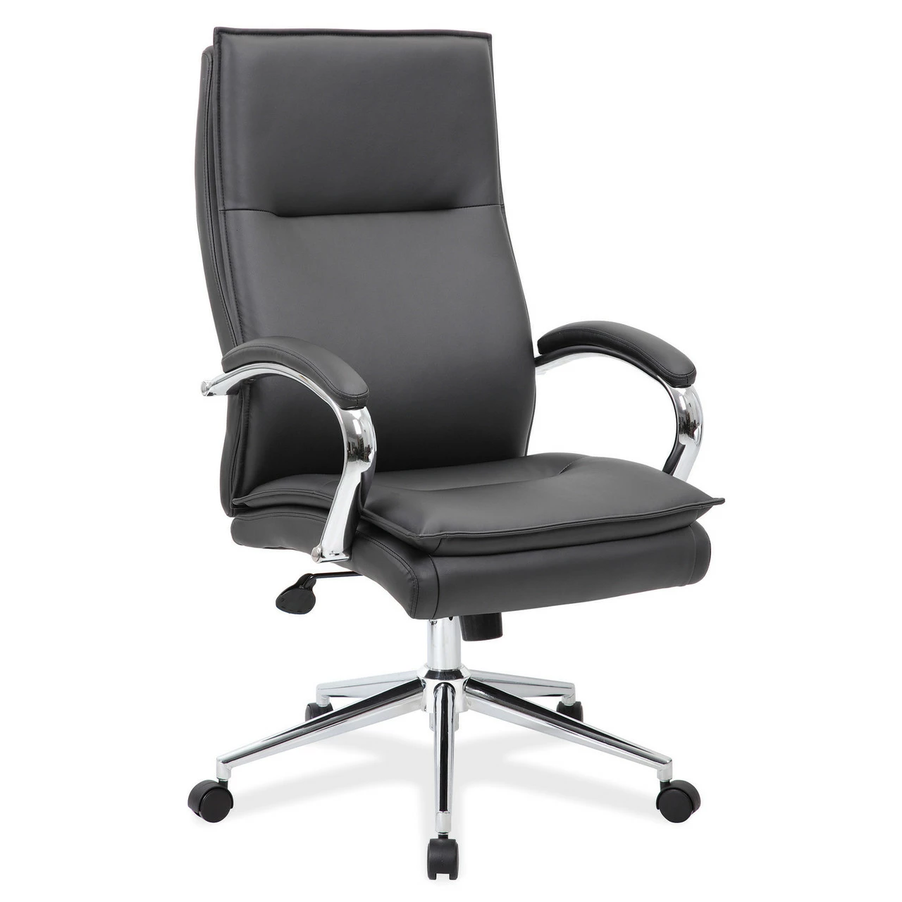 This executive high back chair boasts a clean look and provides unmatched comfort. With its fixed arm rests and all over padded upholstery, you will work for hours with little to no discomfort. The chair also features a high crown chrome base that gives it a stylish look, while also offering the functionality of movement.