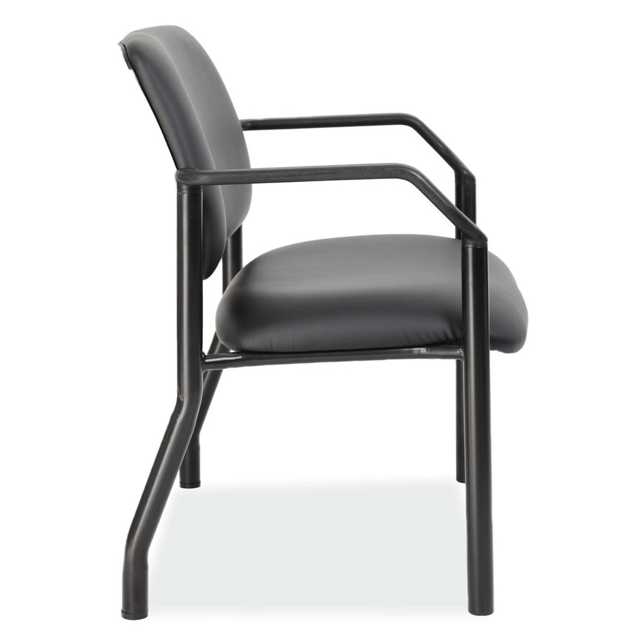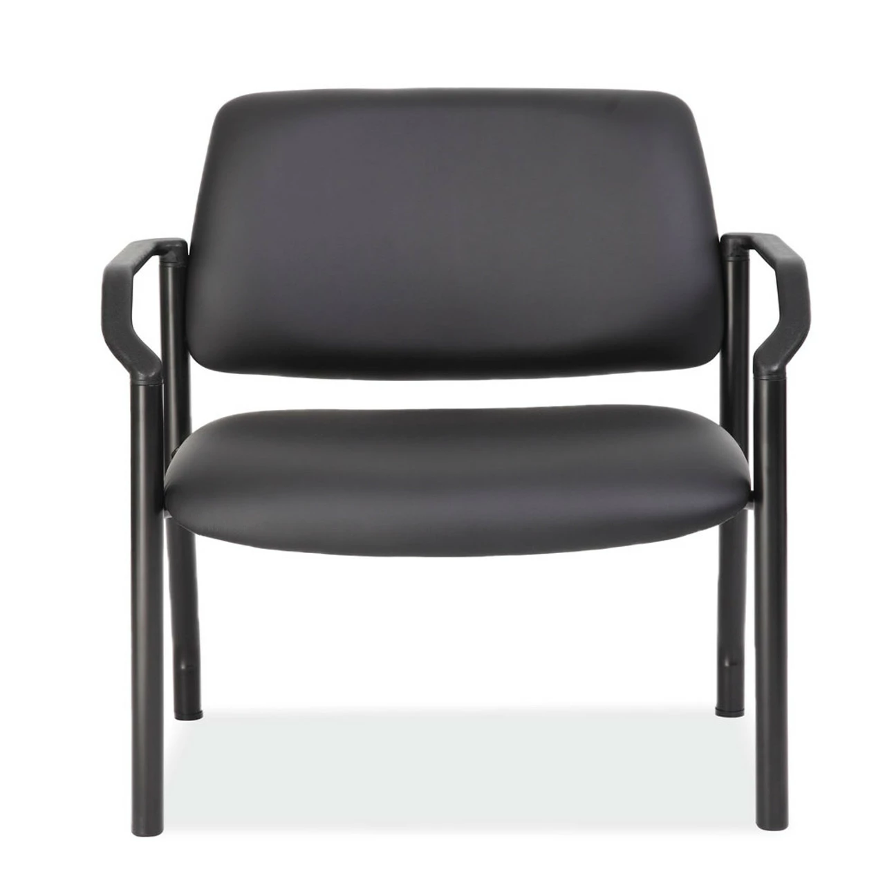 This guest chair from the Big Tall Collection provides ultimate comfort. Able to hold up to 500 lbs., this chair is both durable and functional. Upholstered in black antimicrobial vinyl, that is both clean in looks and hygiene. The waterfall seat cushion adds comfort, while the wall saver back leg design adds conveniency.