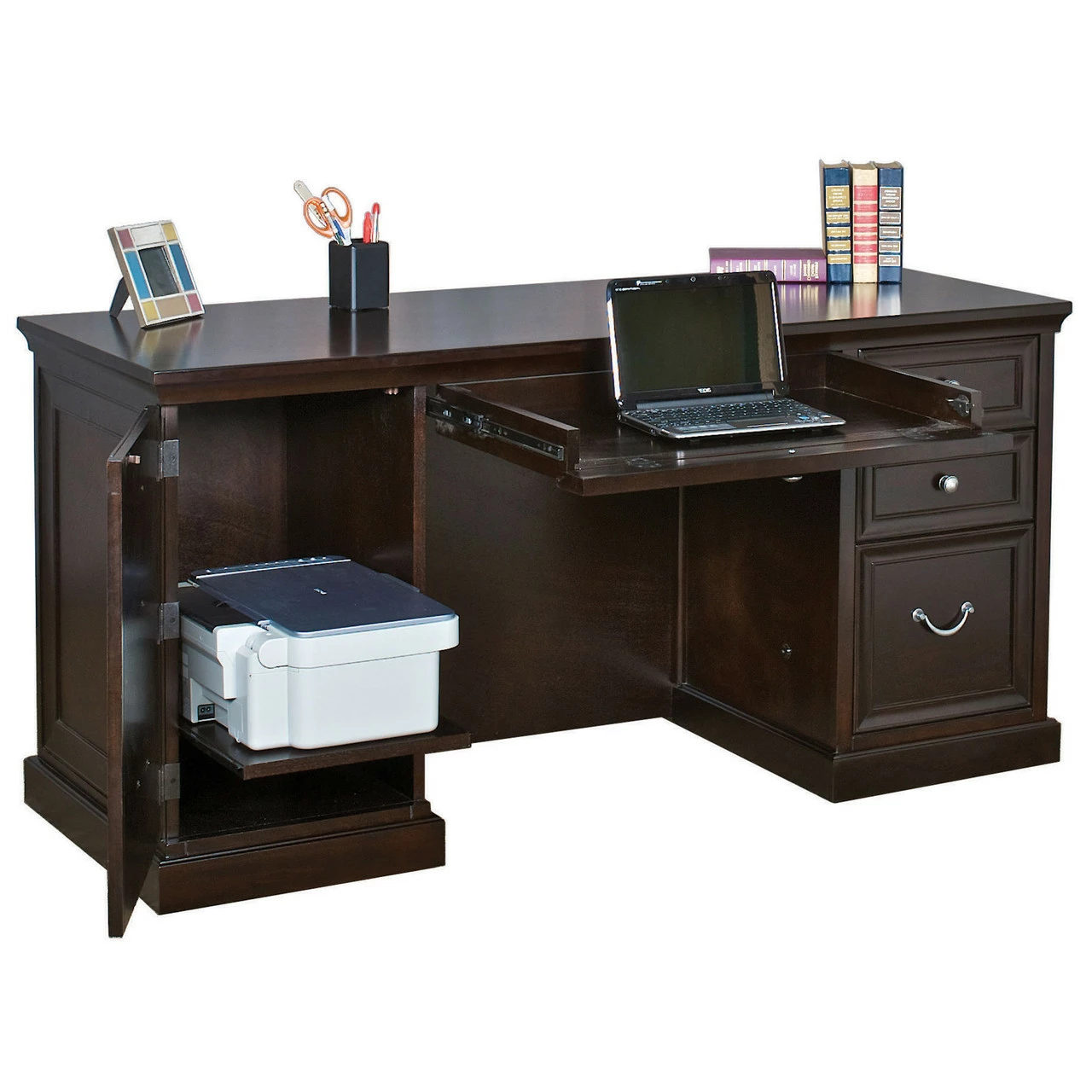 Looking for a durable and substantial desk that will help prevent clutter? This space saver double pedestal desk is perfect for any home office or work office space. Equipped with a drop front keyboard pencil drawer, two utility drawers, one locking legal/letter file drawers, and a pull-out printer tray, you are provided ample storage and working space. The rich espresso finish helps your space look sophisticated and luxurious.