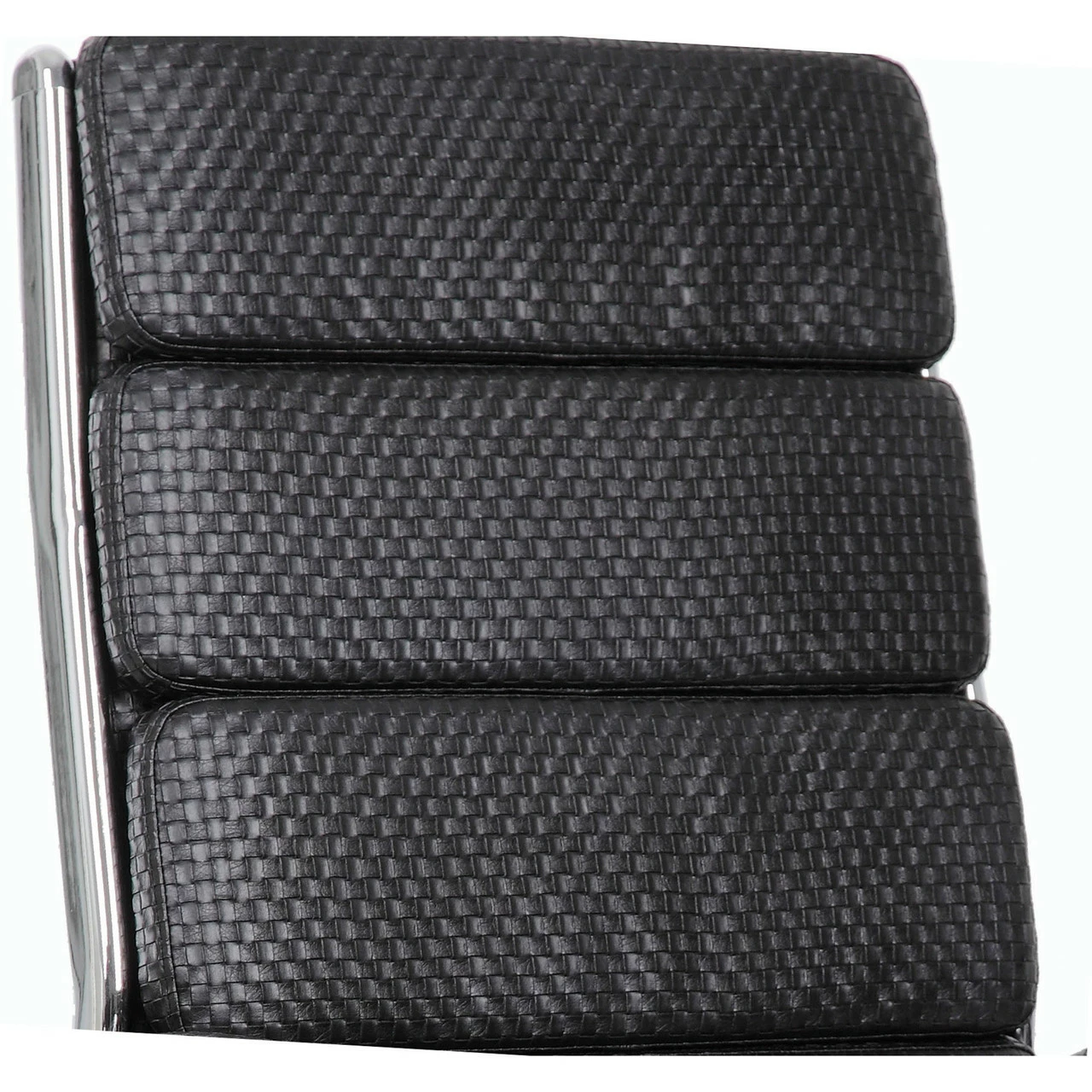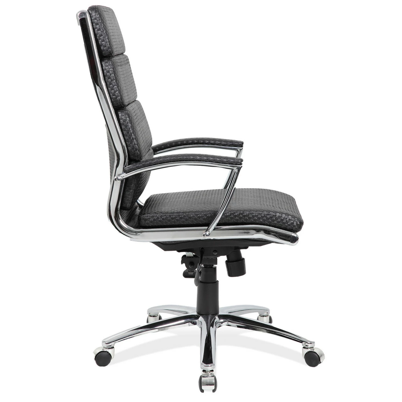The executive Care Soft Plus chair in black woven vinyl with the metal chrome finish is as comfortable as it is handsome. The chair utilizes a two paddle mechanism which designates one paddle for lift and one paddle to release spring tilt or lock; it is very heavy duty. The chair is made with a material called Care Soft Plus which is a trademarked vinyl that is an ultra-soft, breathable upholstery that looks and feels like leather, but is more durable and easy to clean. The chair also offers tilt tension, a pneumatic gas lift and an upright locking mechanism. It has been designed with a sturdy 27 inch chrome base with 2 inch nylon dual caster wheels and has a weight capacity of 275 lbs.