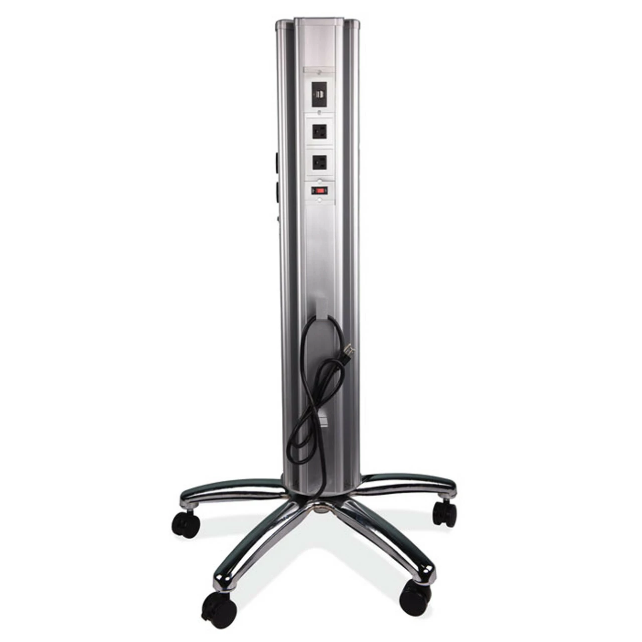 Have convenient access to power within any collaborative workspace, with this sleek and versatile four sided mobile power tower from OfficeSource. This power tower has two electrical outlets as well as 2 USB ports on each side, making it perfect for multiple users to be connected at the same time. This mobile power tower is ideal for laptops and tablets in your workspace, as it is easily mobile on its heavy duty casters. This power tower is available in a sleek silver color that will look great in any office setting. This power tower also comes with a 14′ power cord so you no longer have to worry about extension cords being a hazard.