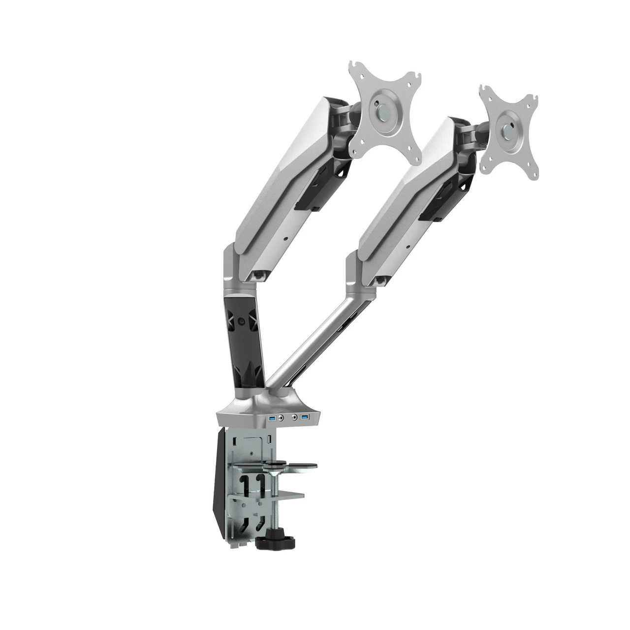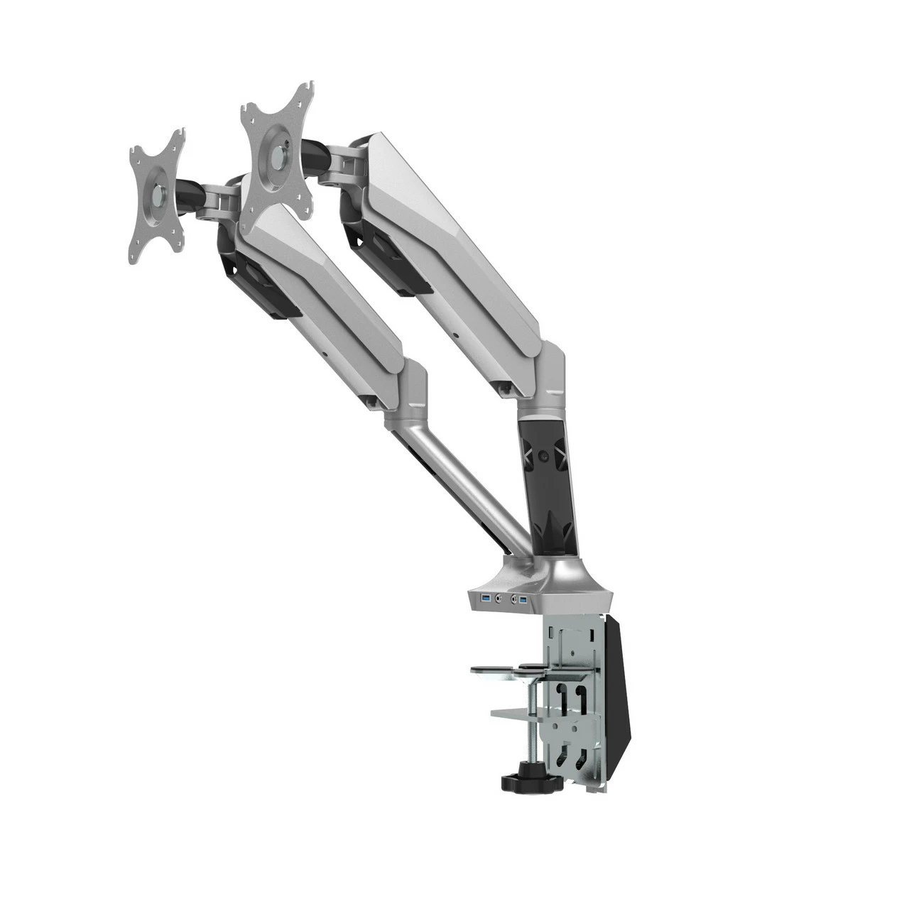 Using this dual black monitor arm, you will create so much extra and usable space on your desk. Not only is this dual monitor arm capable of rotating 360 degrees, but it can also adjust 85 degrees upward or 15 degrees downward to help you find the most ideal screen viewing position for both your monitors. The 360 degree rotation also enables you to share what is on your screen with others in the room, without anyone having to move from their seat!