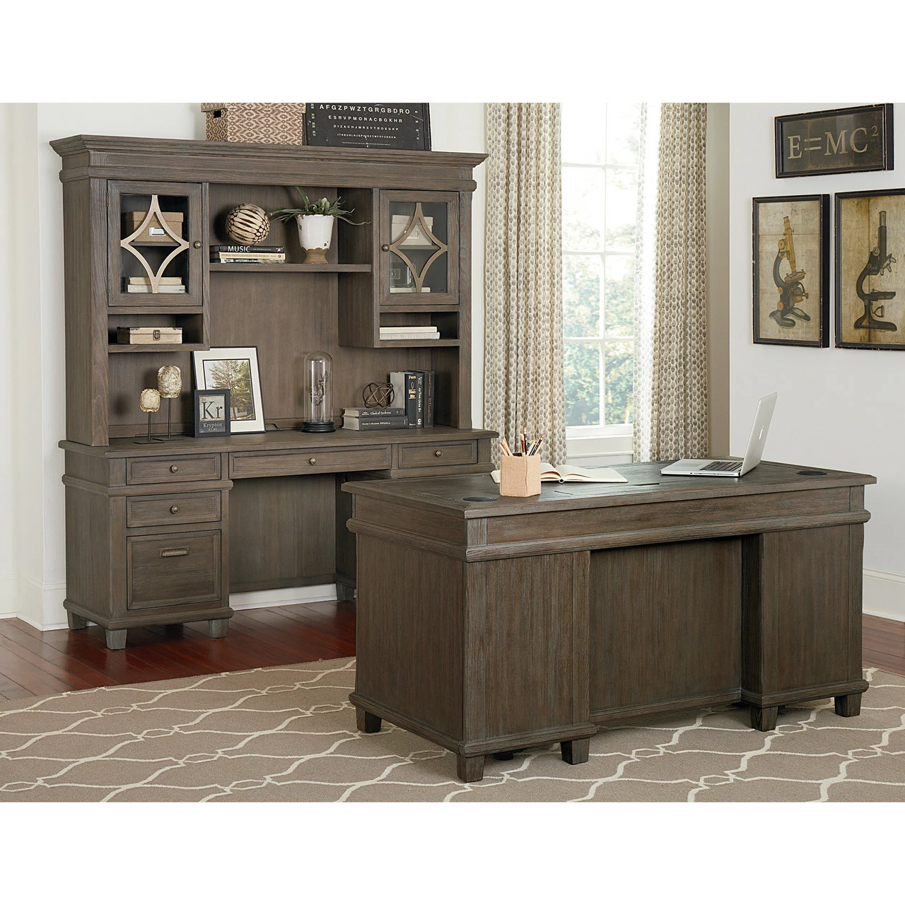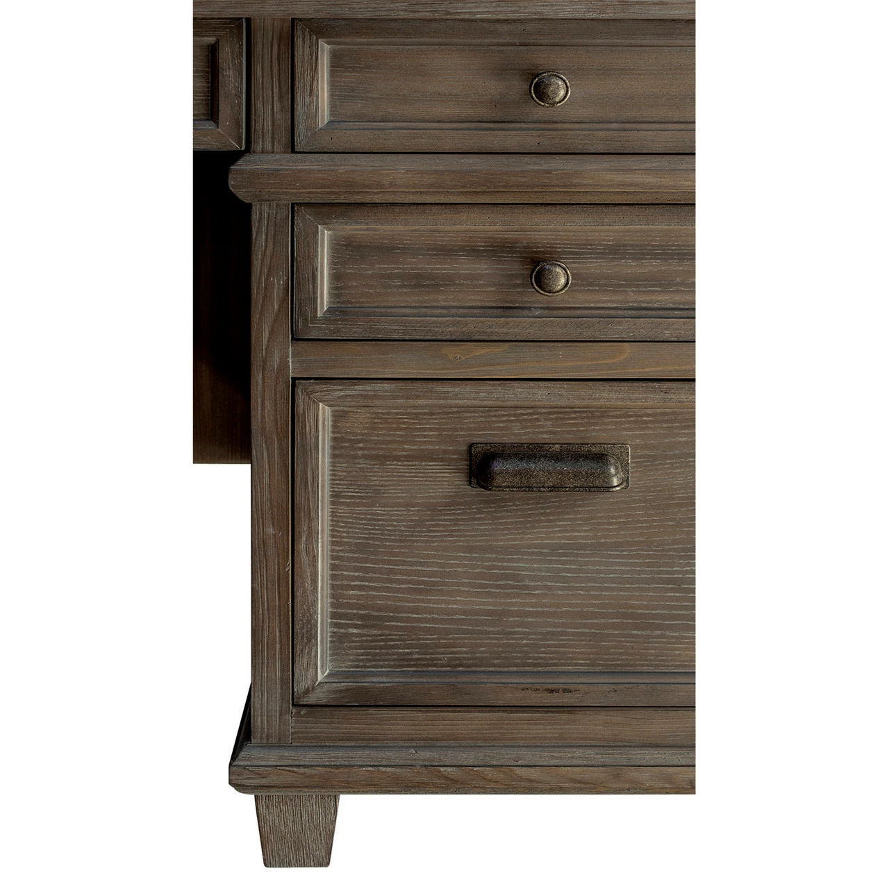 The double pedestal desk from the Monroe Collection is your solution for an antique vibe and functionality. With one pencil drawer, four utility drawers, two legal/letter file drawers, and two wire management grommets, this desk gives you ample work space, while keeping you organized. Coming in a weather dove gray finish, with mottled hardware, this desk is your answer for unique style and elegance.