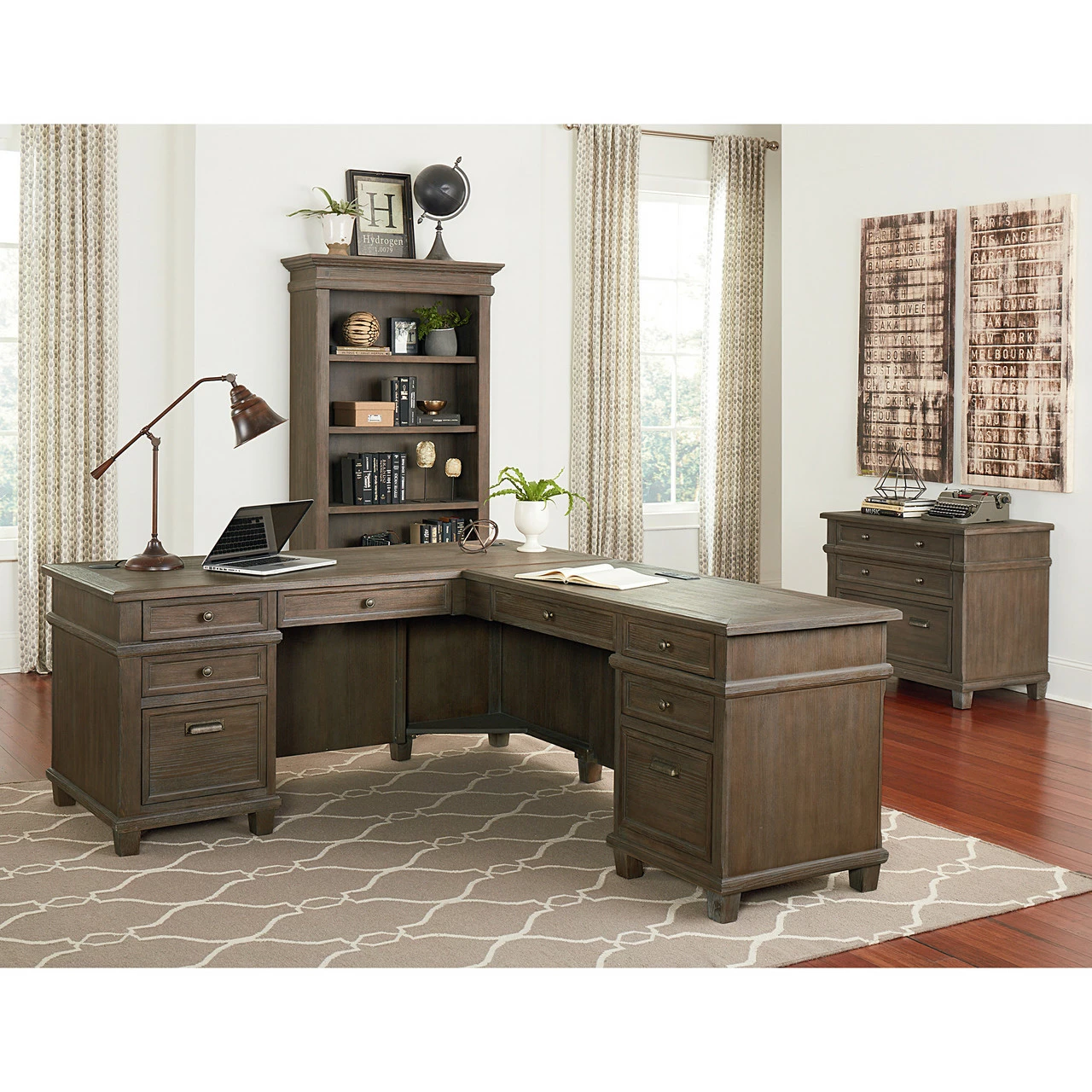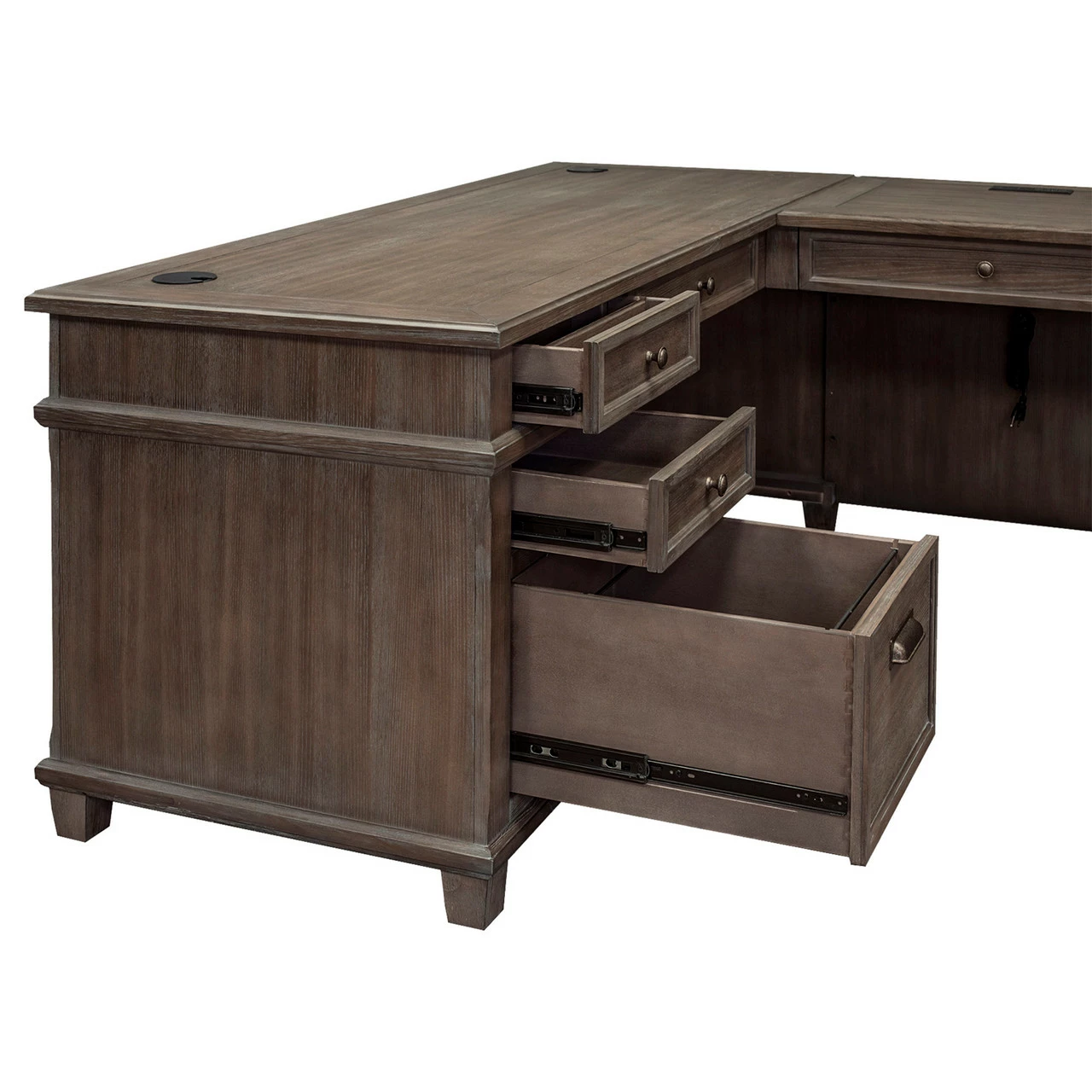This right return desk, coming in a weathered dove gray finish, with mottled hardware, is your solution for a unique desk with an antique feel. The desk comes with one drop front keyboard pencil drawer, two utility drawers, one legal/letter file drawer, and two wire management grommets, while the return is equipped with one drop front keyboard pencil drawer, one utility drawer, one pull-out printer tray, two AC outlets, and three USB outlets, giving ample storage and working space. This desk and return must be sold as a set.