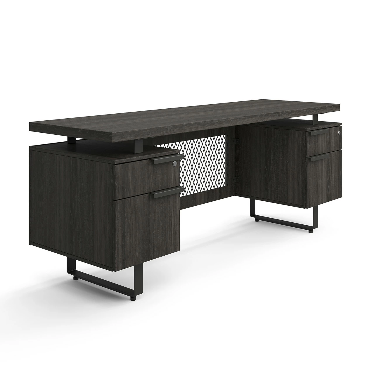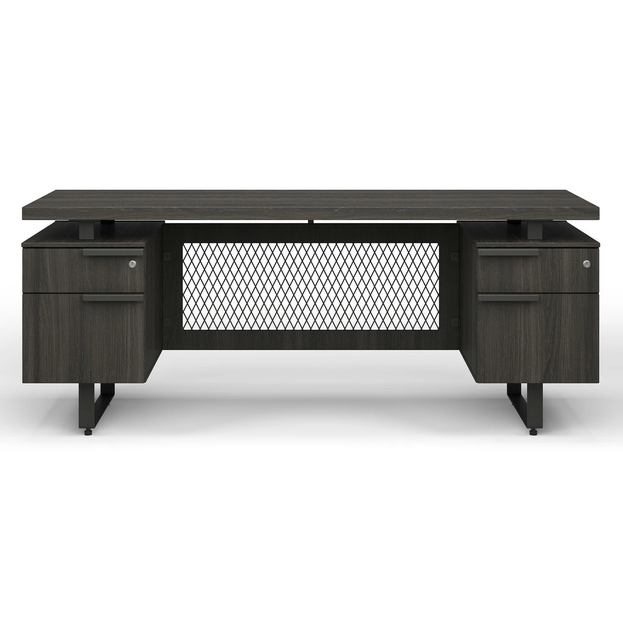The OfficeSource Double Pedestal Credenza brings contemporary elegance with its charcoal metal accents. Complemented with a smoked Gauntlet Gray color palette, this premium 1⅝” thick Gauntlet Gray working surface rests atop elegant Graphite pillars of steel. Customize it to fit your home or office space.