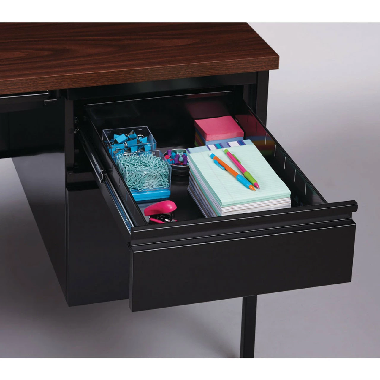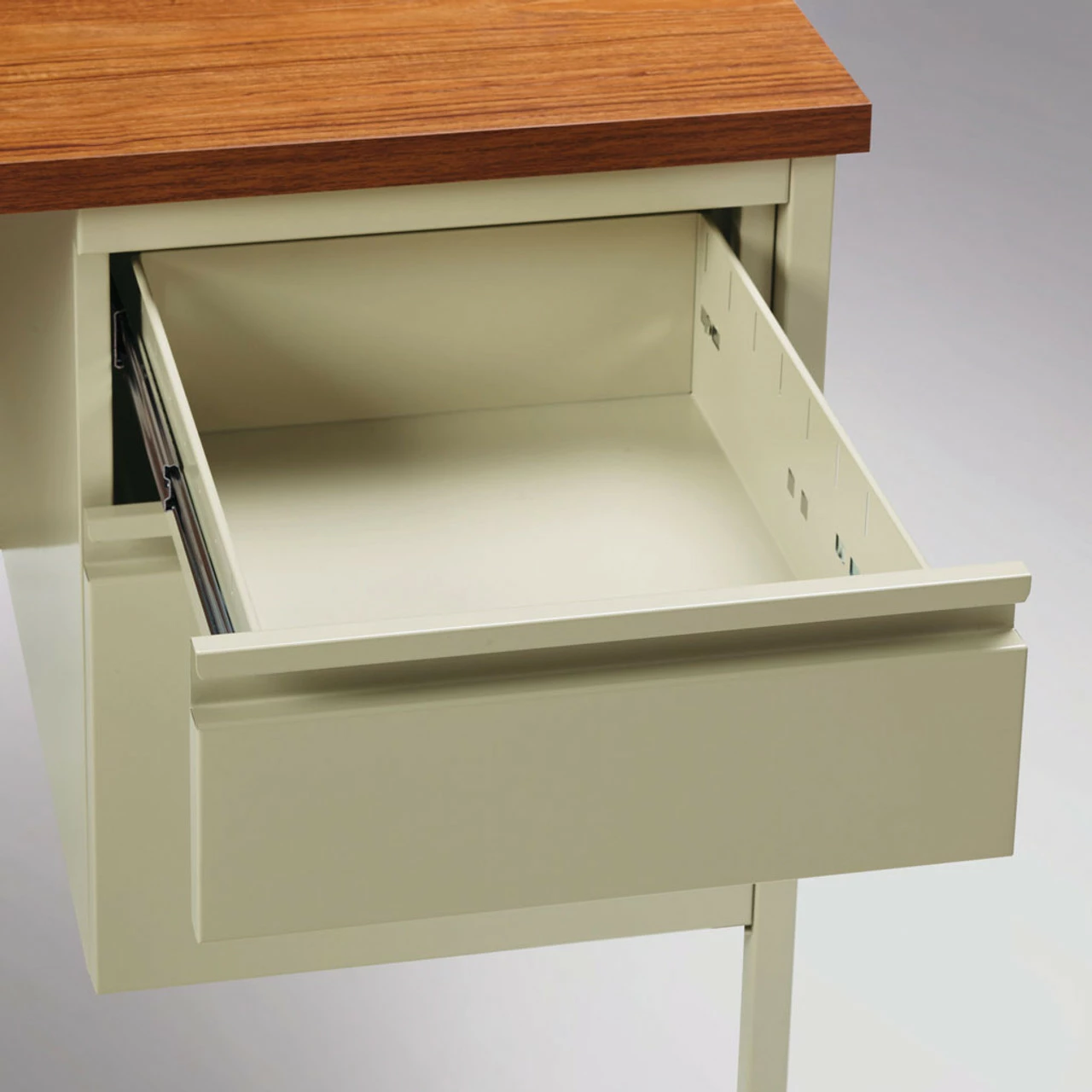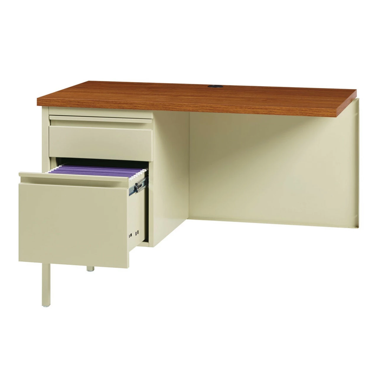 A durable solution for long-term heavy use, our metal desk is a professional desk solution for business, government, and school administrative offices and classrooms. The laminate makes the top easy to clean and disinfect.