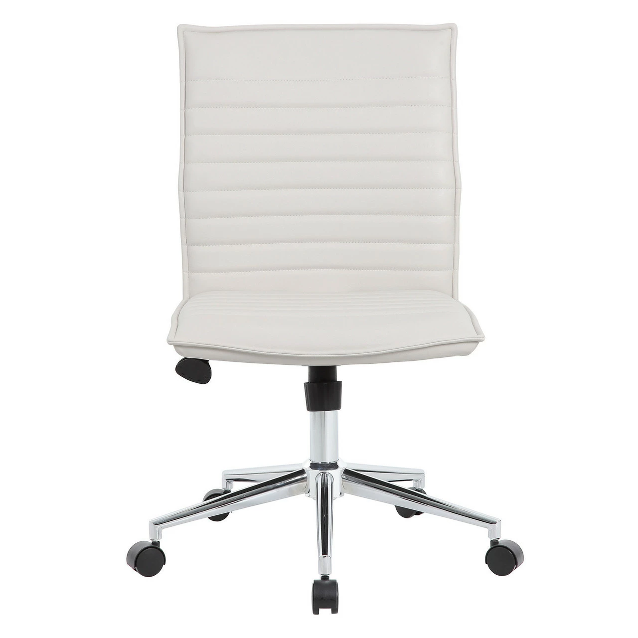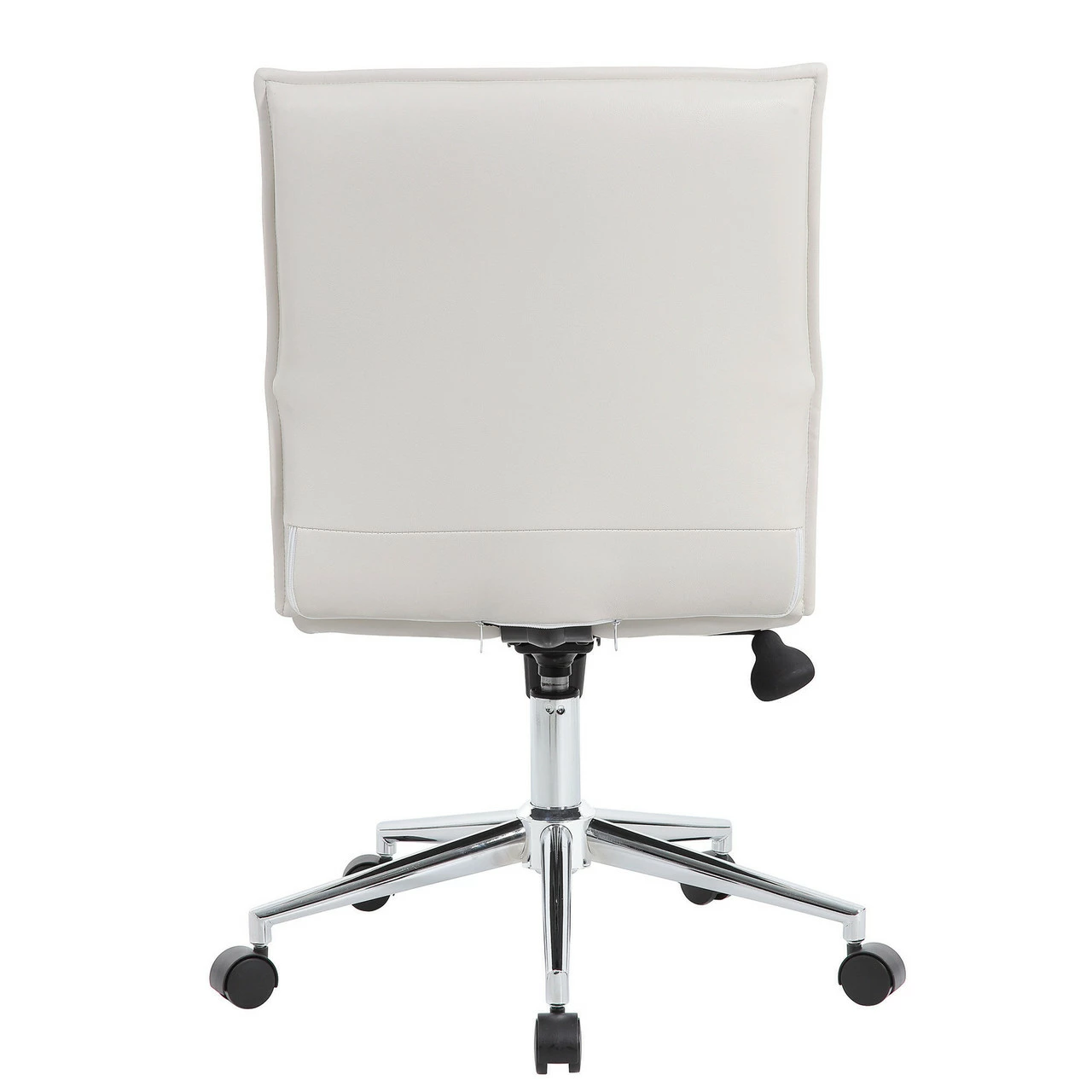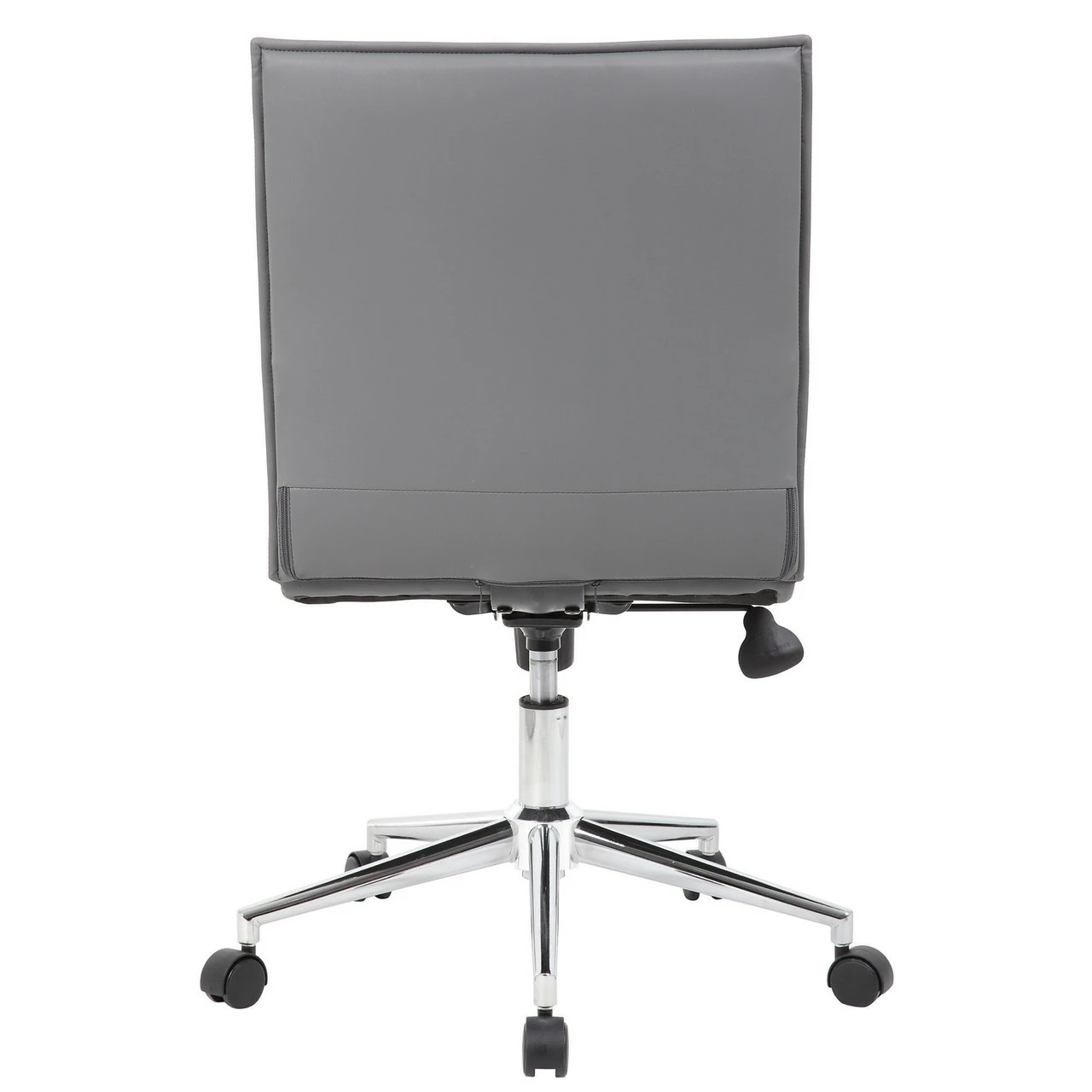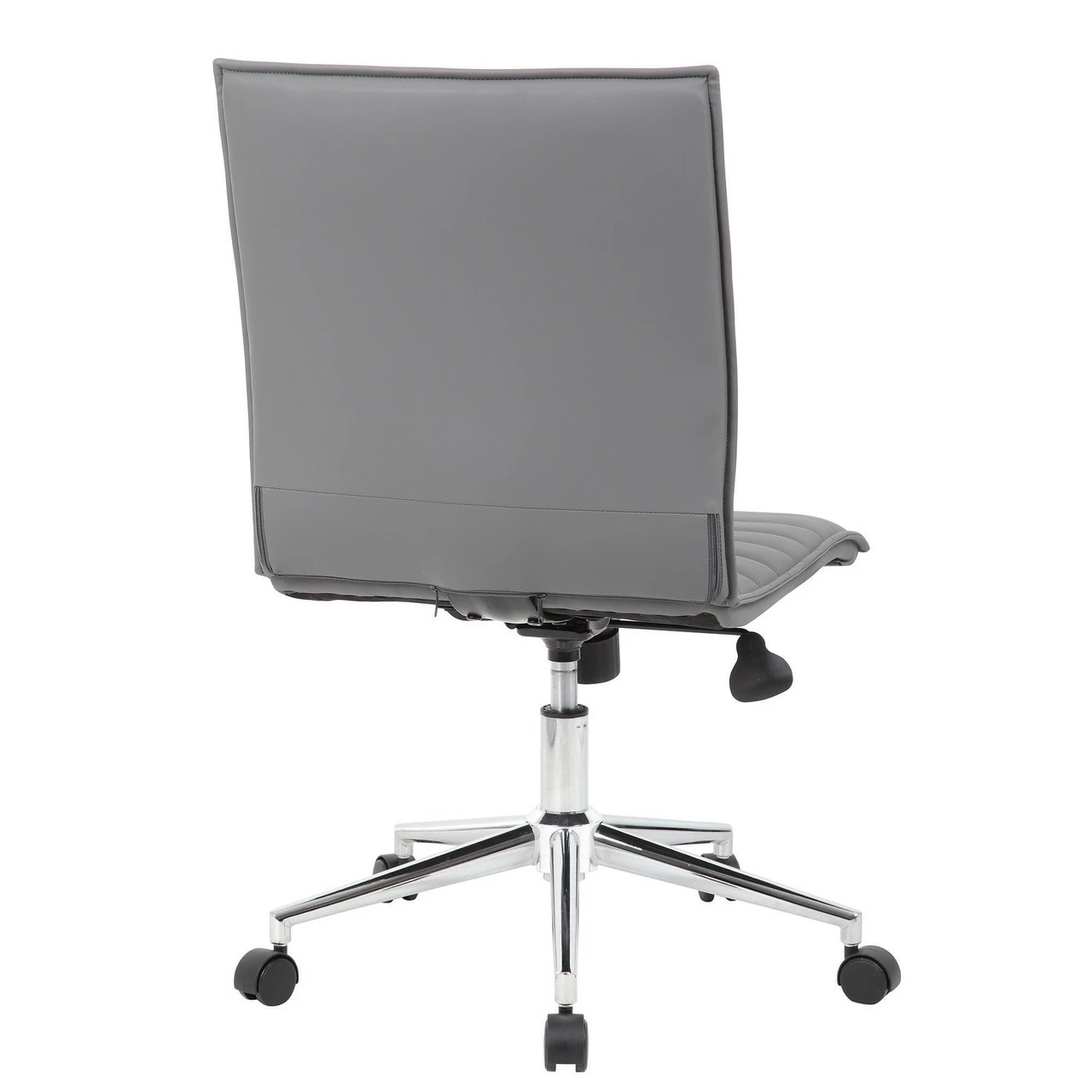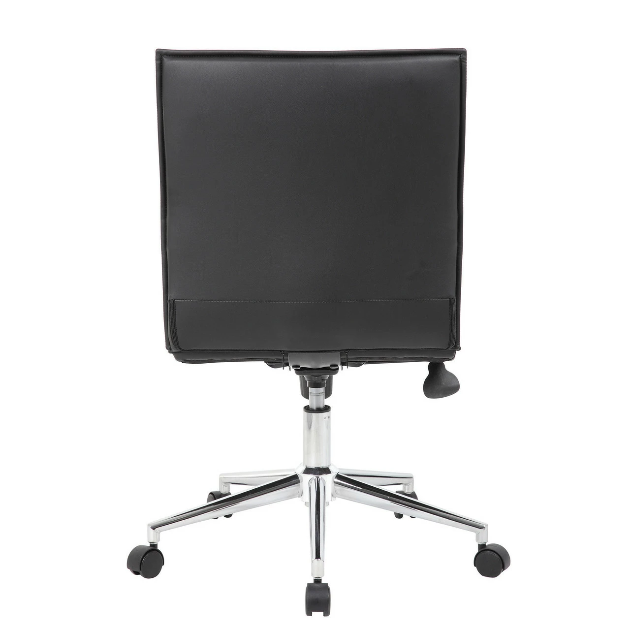This armless task chair is designed with a look that brings any room or office to the next level. The chair features a gorgeous and strong chrome 25 inch base with 2 inch nylon dual wheel castors that adds that perfect pop of metallic color to any room. In addition to looking fantastic, the chair also features a spring tilt mechanism, a pneumatic gas lift for easy height adjustability, tilt tension and an upright lock, while also boasting a weight capacity of 275 lbs.