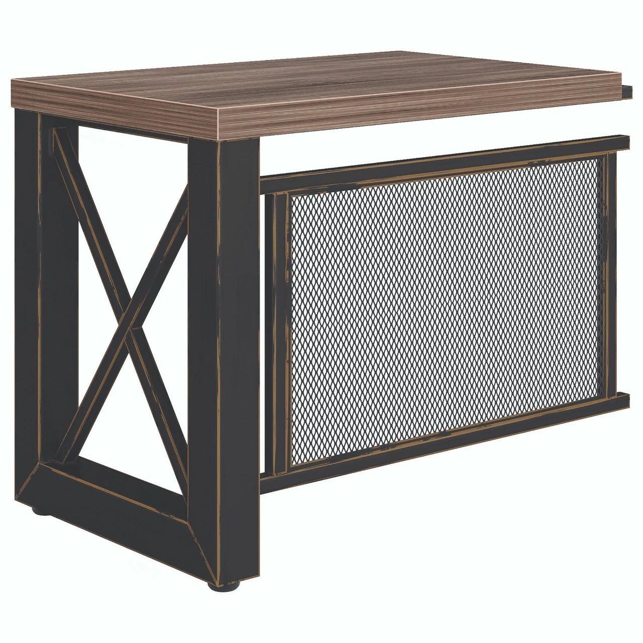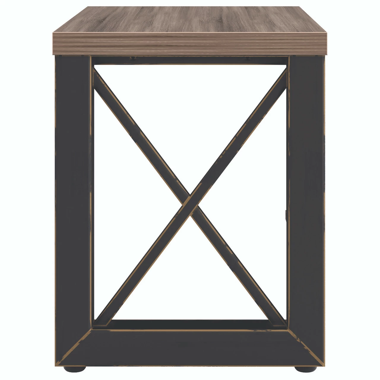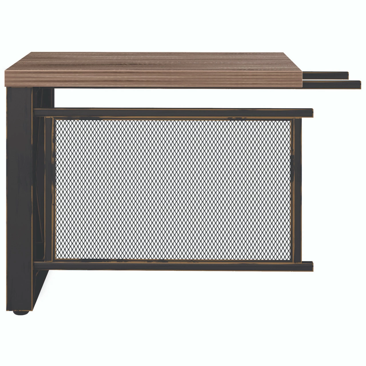 Modern design meets rustic style in the Riveted Collection Industrial Return and gives one added surface space. The distressed wood laminate top creates a reclaimed aesthetic. With a thick top and heavy industrial metal cross bar base, there is added structure and stability.
