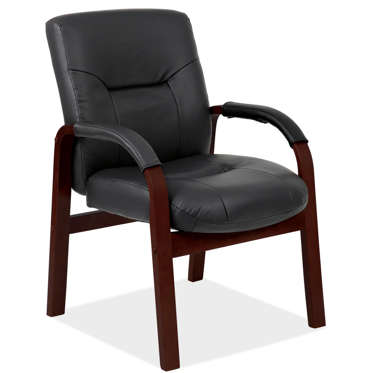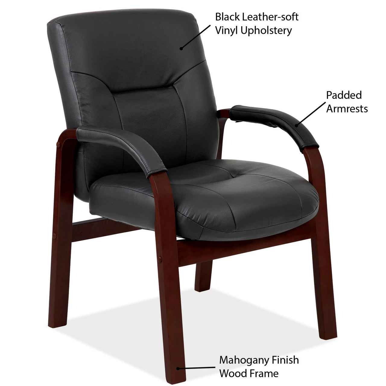 Give your office a touch of elegance with this traditional style guest chair from OfficeSource. This Spencer Collection guest chair combines the warmth of wood and contemporary styling in this timeless design. This guest chair offers a luxurious seating option to enhance your waiting room or office. Let your guests enjoy the comfort of a cushioned seat and back upholstered in black vinyl. With an elegant mahogany finish on all wood components, this superior chair will satisfy all of your office aesthetic needs. The comfort, elegance and style of this chair will last for years to come.