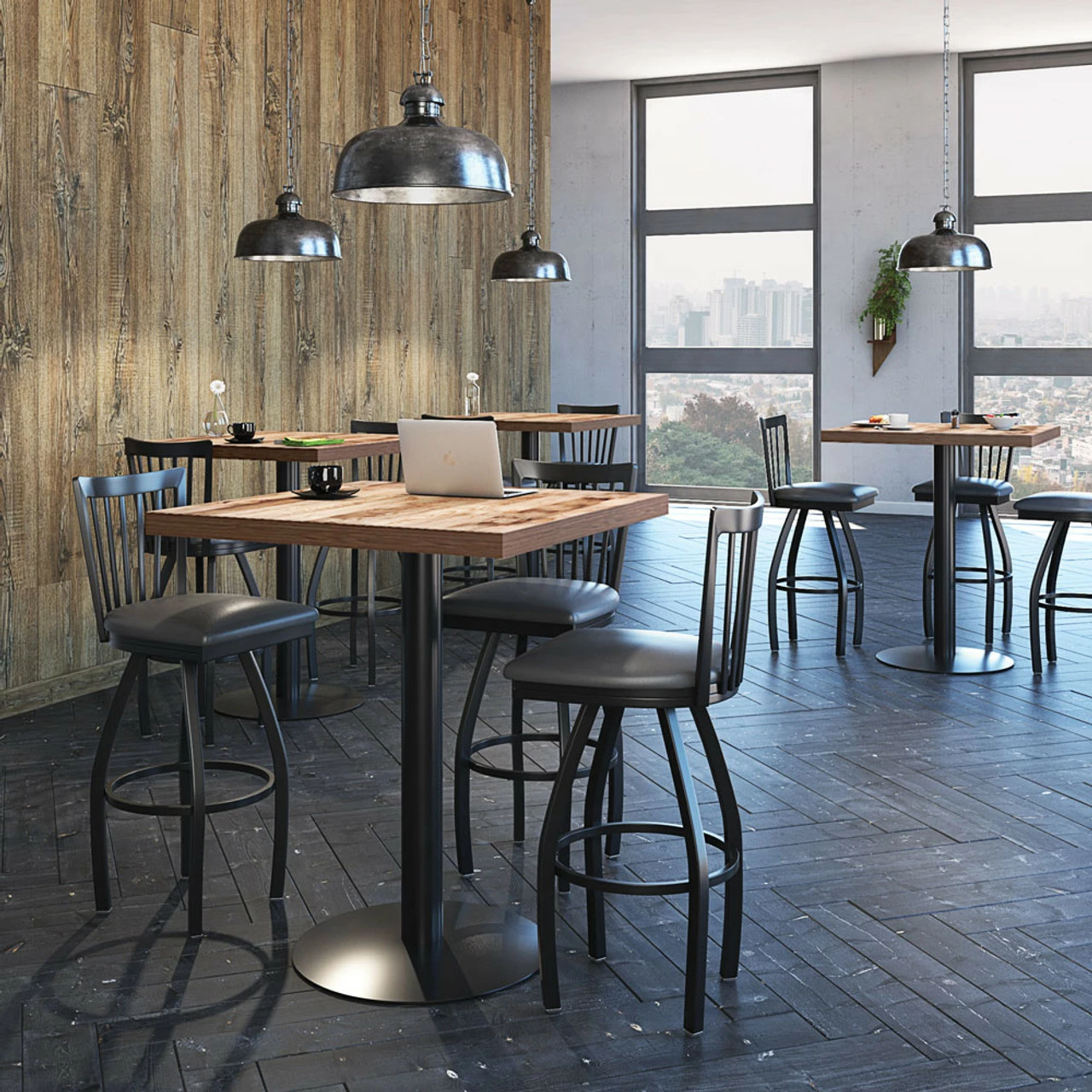 OfficeSource | Universal Collection | Cafe Height High Back Wood Chair With Cushioned Seat And Black Wrinkle Steel Frame