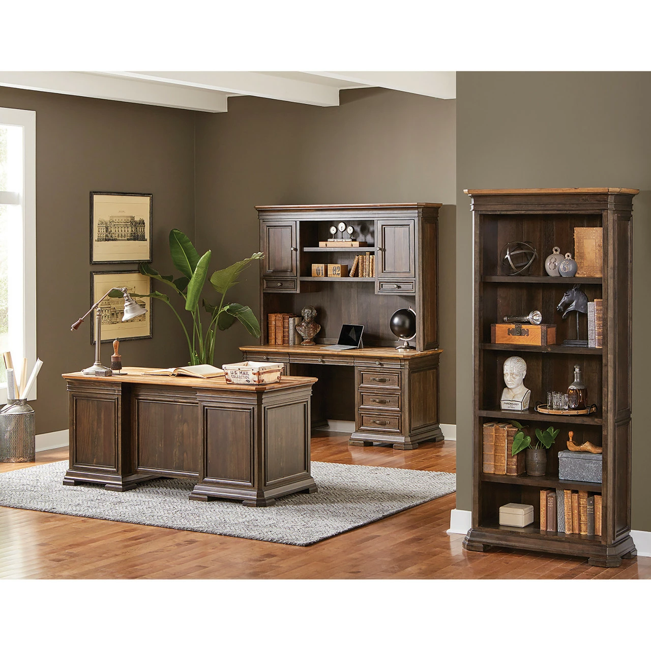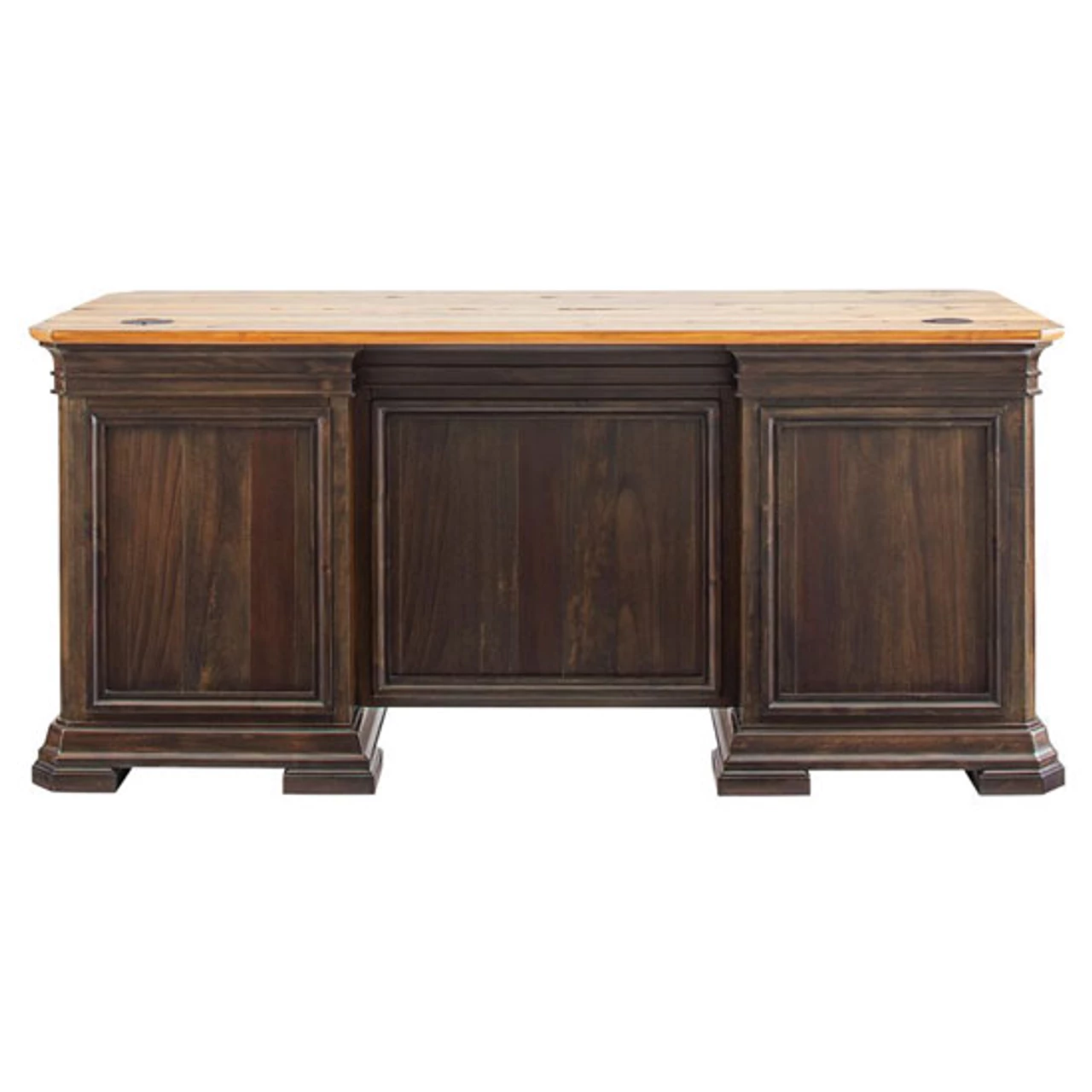 Double pedestal desk provides the elements to create a truly inspirational office environment. Hand planked wood veneers in a rich, dark roast finish the color of freshly brewed coffee, show highlights of natural wood that has aged and is mildly distressed. Distressing includes rasping, chopping and worm holes, along with varied species, solid wood plank tops that accent the dark finish and emphasize the wood’s natural beauty for two-tone authenticity. Antique bronze hardware adds a shimmering touch.