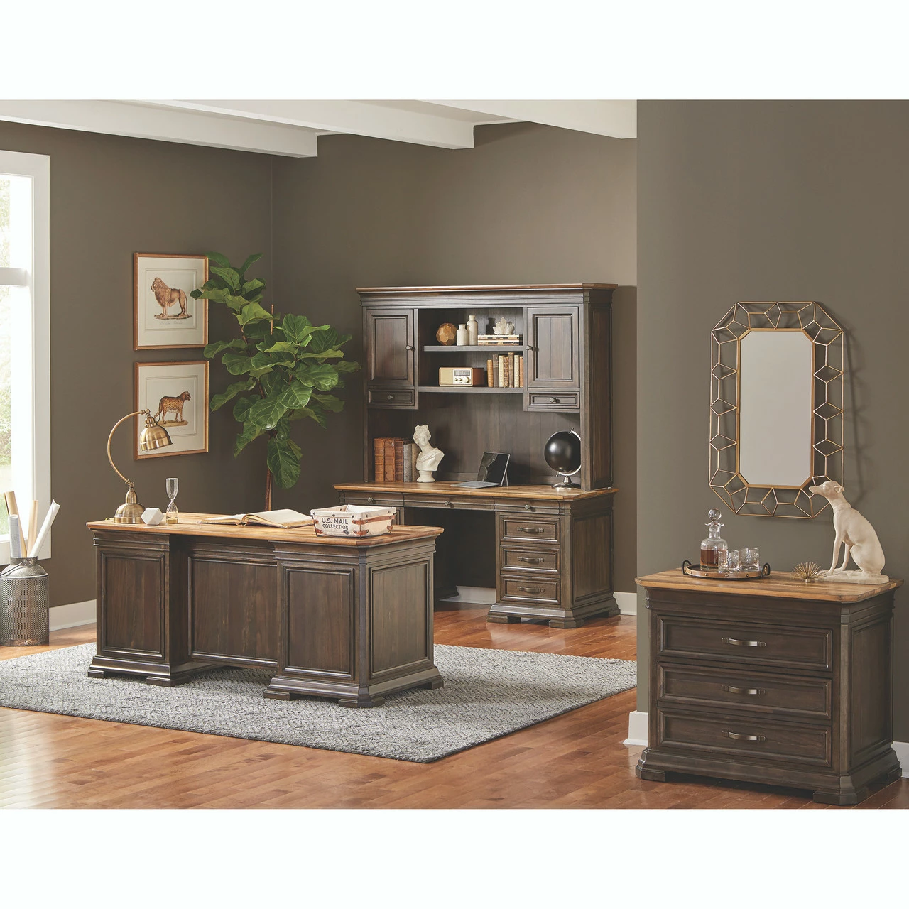 The executive typical provides the elements to create a truly inspirational office environment. Hand planked wood veneers in a rich, dark roast finish the color of freshly brewed coffee, show highlights of natural wood that has aged and is mildly distressed. Distressing includes rasping, chopping and worm holes, along with varied species, solid wood plank tops that accent the dark finish and emphasize the wood’s natural beauty for two-tone authenticity. Antique bronze hardware adds a shimmering touch.