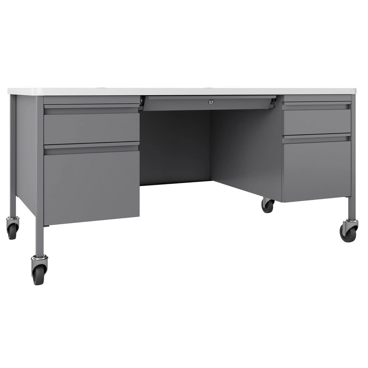 Double pedestal teachers desk that provides a practical desk solution to any educational environment. The T-mold edge promotes safety while the laminate provides a durable scratch and stain resistant surface that is easy to clean and disinfect. Four casters add mobility and allow for easy classroom reconfiguration.