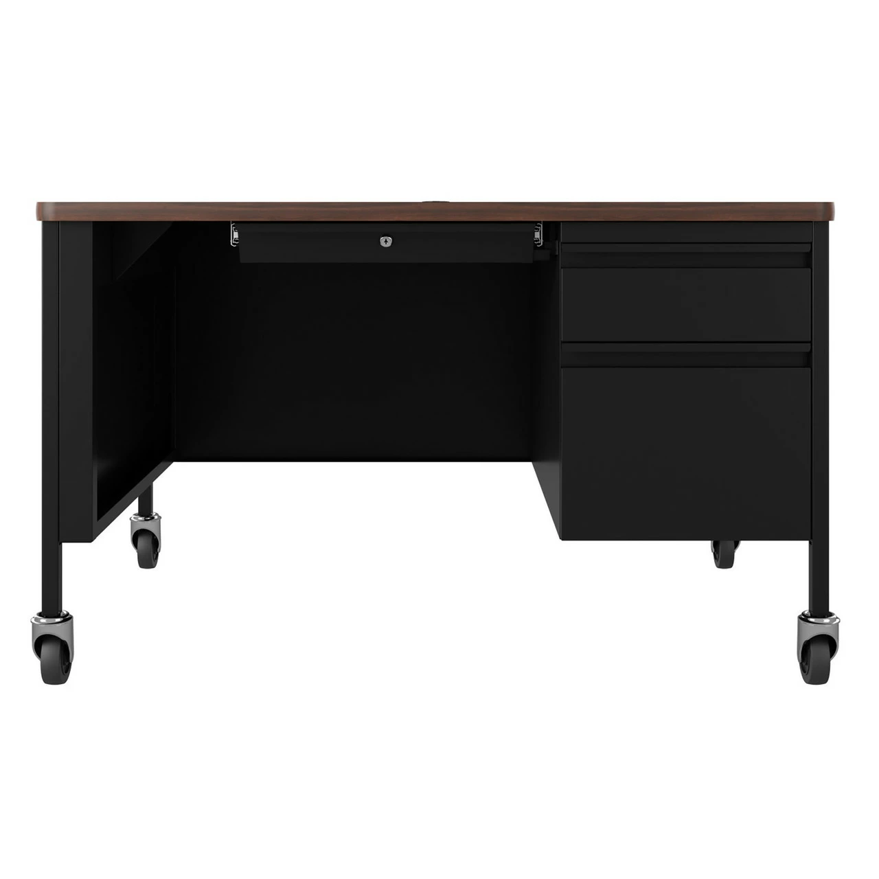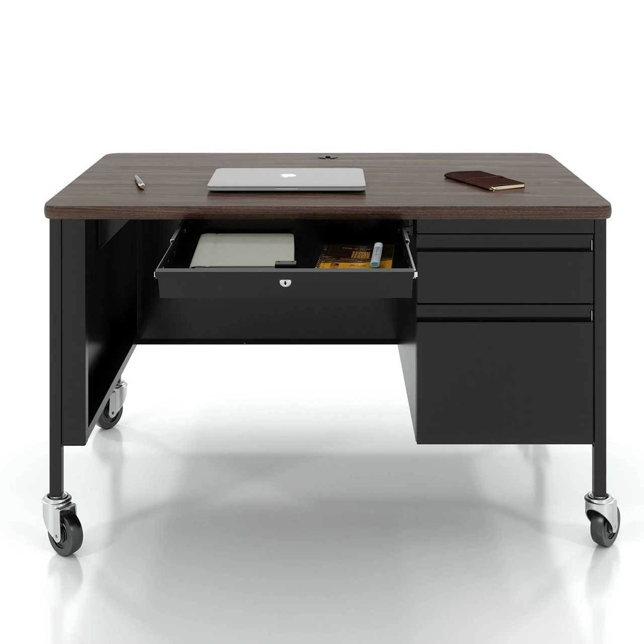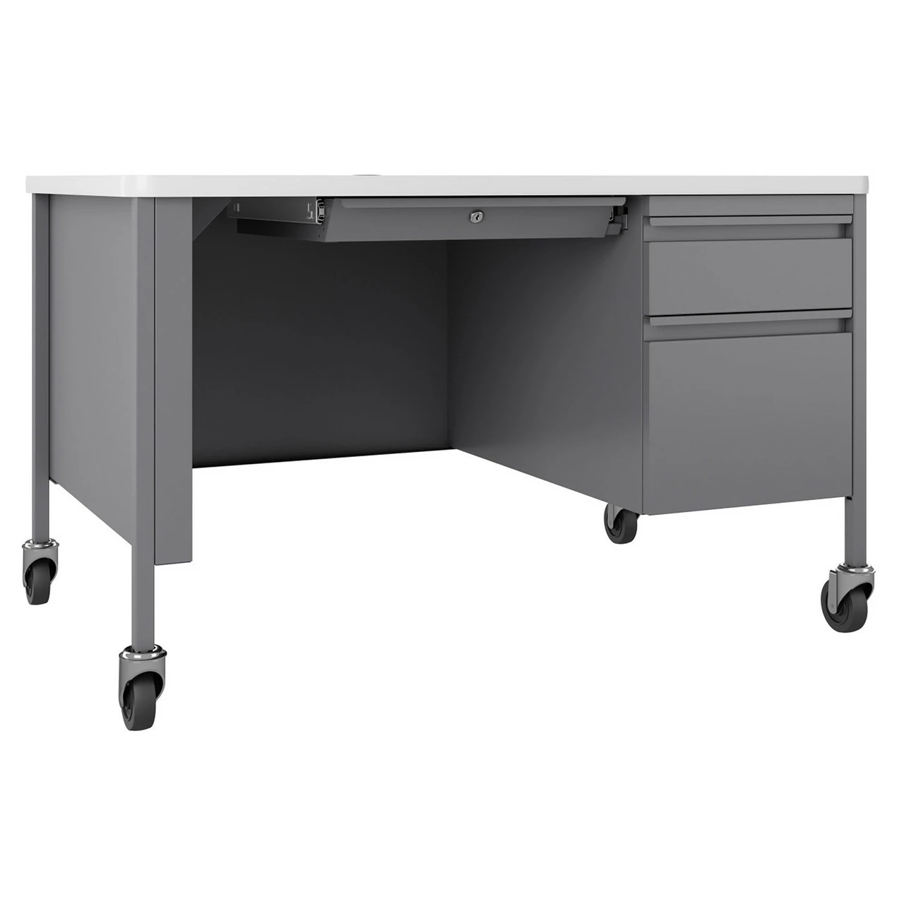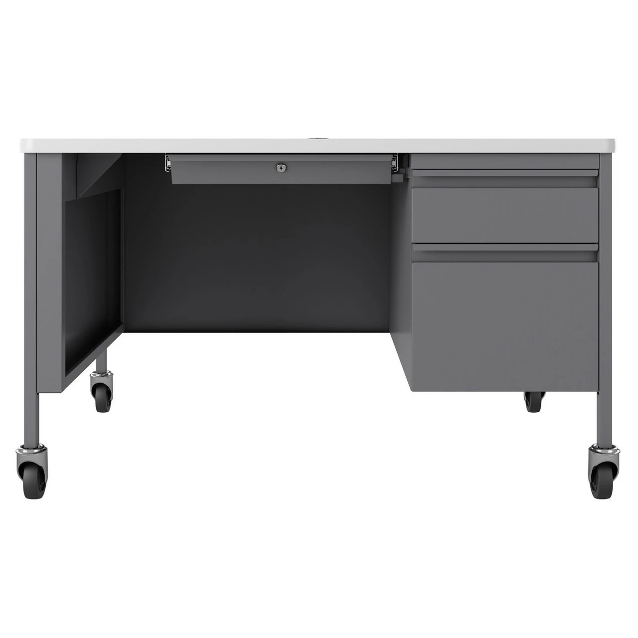 This teacher’s desk is constructed with high-quality steel and materials that are suitable for heavy use. Topped with a durable T-mold laminate designed for the classroom. Standard features include full extension ball-bearing slides for smooth drawer action and a locking center drawer.